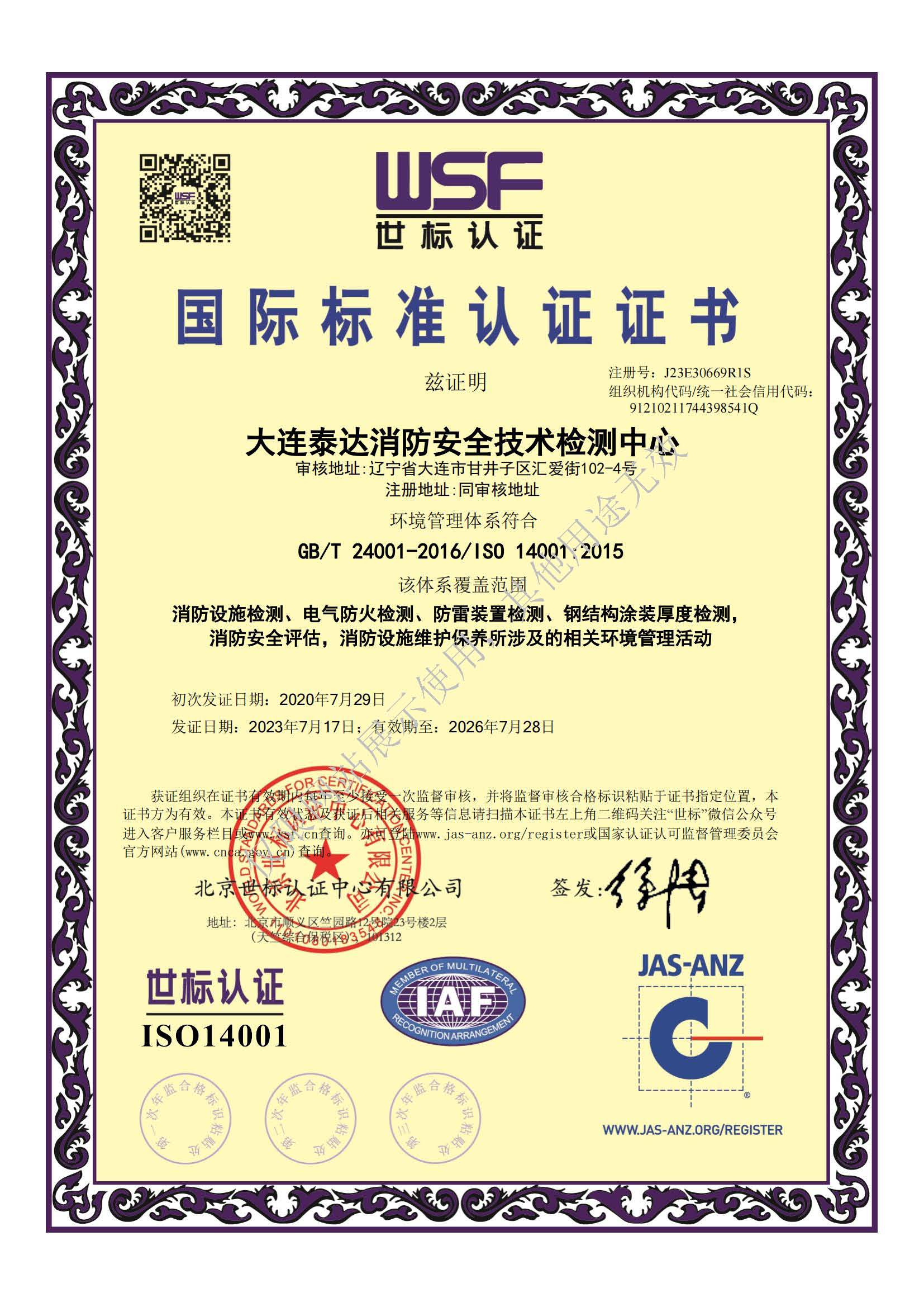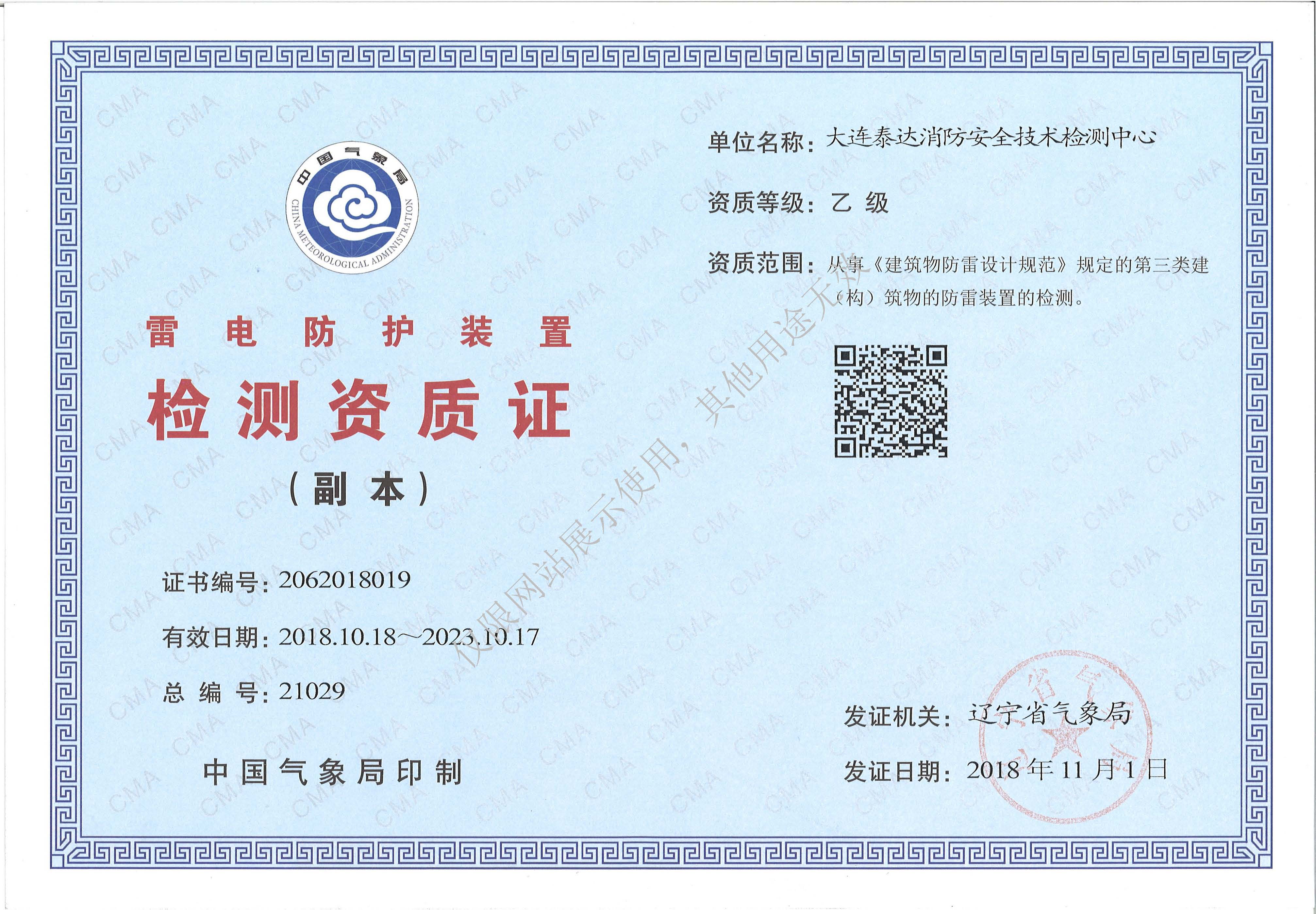 · 是經(jīng)“社會消防技術服務信息系統(tǒng)”備案并公示的消防技術服務機構,已取得中國氣象局頒發(fā)的雷電防護裝置檢測資質(zhì)證書、遼寧省質(zhì)量技術監(jiān)督局審核批準的檢驗檢測機構資質(zhì)認定證書(CMA)及包括消防檢測、電氣檢測、雷電防護裝置檢測、防火涂層厚度檢測等在內(nèi)的200余項檢驗檢測能力,取得大連市應急管理局頒發(fā)的安全生產(chǎn)標準化證書,獲得質(zhì)量管理體系、環(huán)境管理體系、職業(yè)健康安全管理體系認證證書,是經(jīng)備案的高新技術企業(yè),可獨立出具具有證明作用的檢測報告。